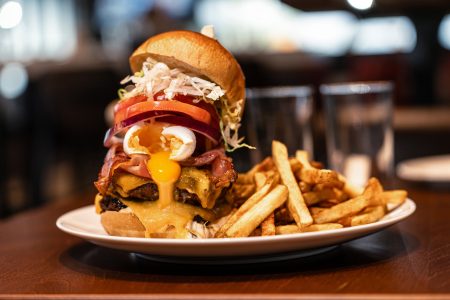 Double galette de boeuf, tomate, cœur de romaine, double cheddar, double bacon, œuf, sauce maison